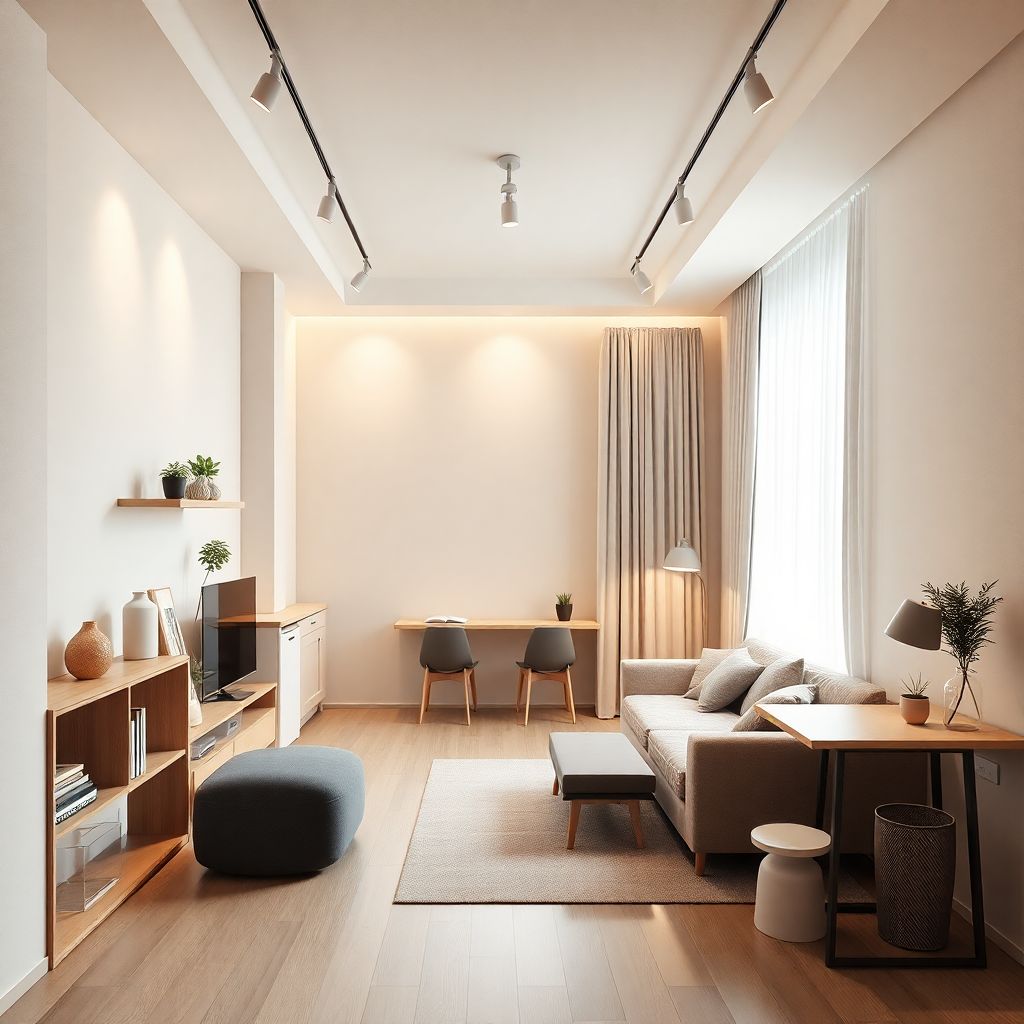 Для небольшой студии оптимально сочетать тёплый и нейтральный свет. В «гостиной» и у кровати комфортна температура 2700–3000 К, в зоне кухни и рабочего места — 3500–4000 К. Индекс цветопередачи (CRI) лучше брать не ниже 90, иначе кожа и продукты на кухне будут выглядеть неестественно. Световой поток для общего освещения — примерно 100–120 лм на квадратный метр, плюс локальные источники. Если потолки невысокие (2,5–2,7 м), лучше отказаться от громоздких подвесов в центре и использовать накладные споты и треки, чтобы визуально не «опускать» плоскость потолка.